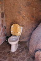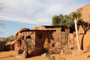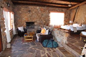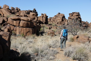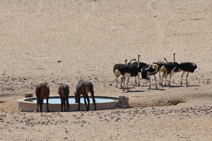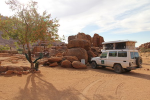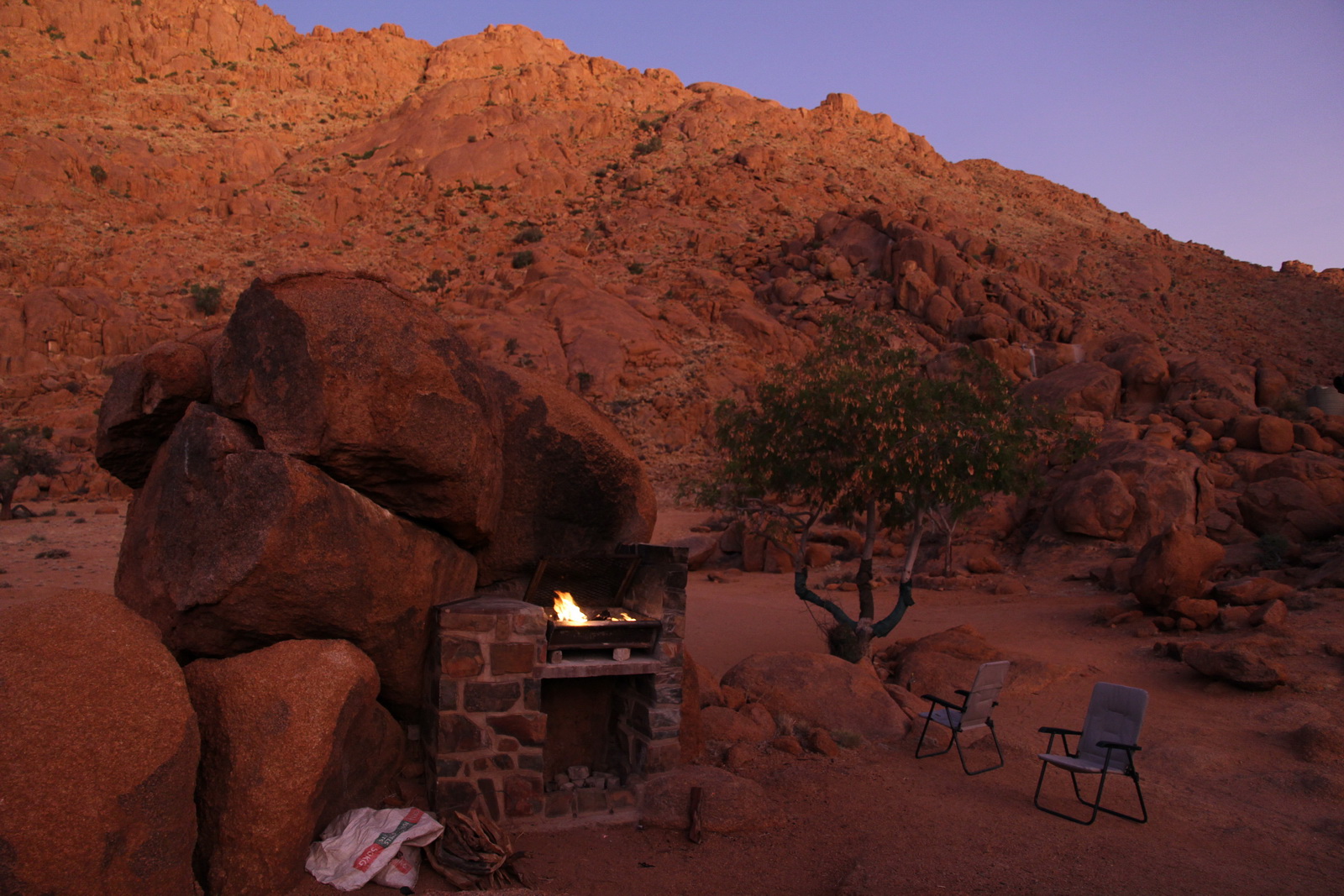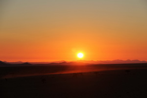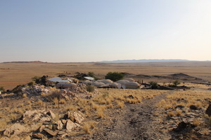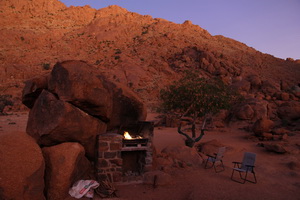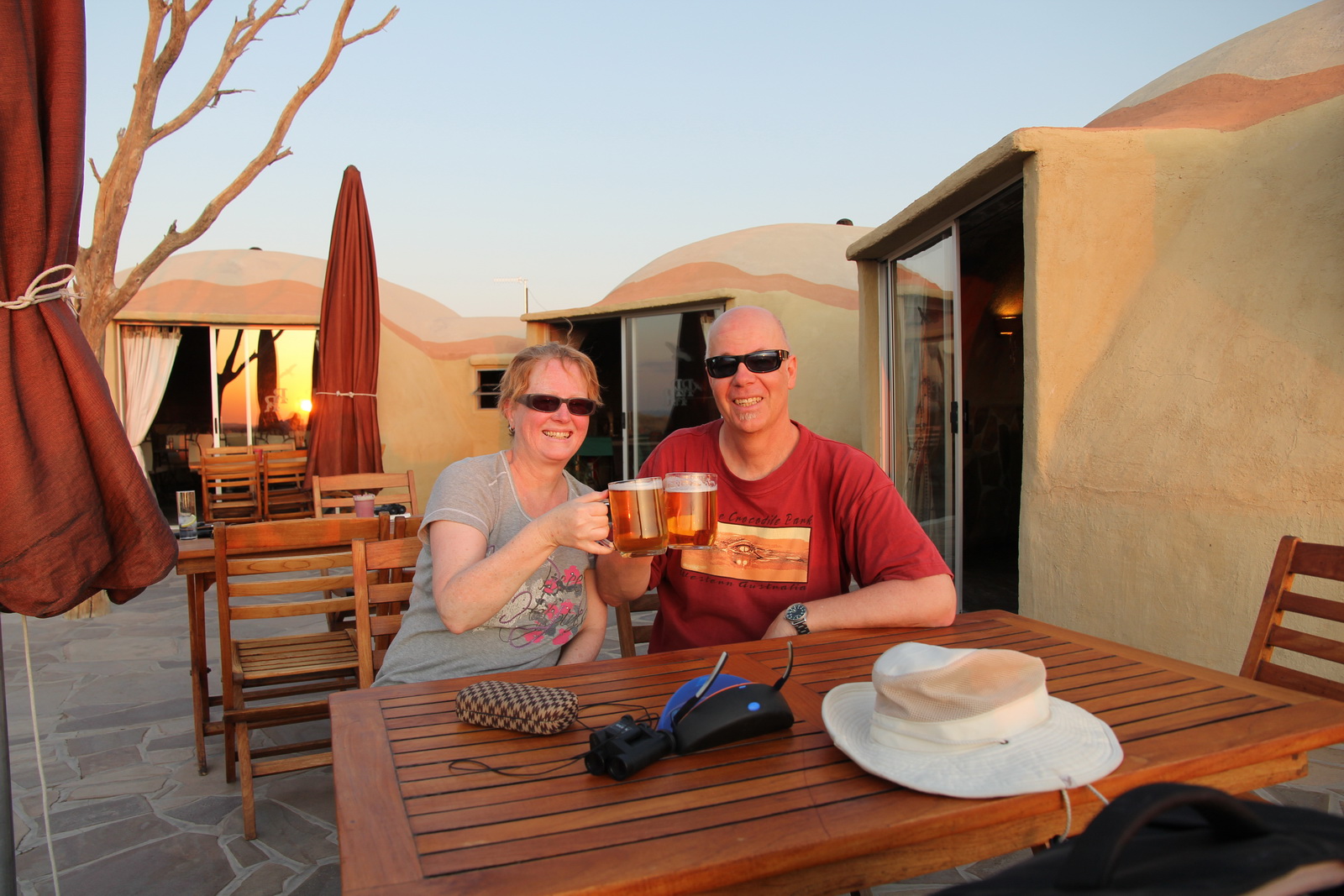 Mit der Sonne aufgestanden, und um 8 Uhr fahren wir die 5 km zum Sesriem Canyon und gehen runter. Es ist noch angenehm kühl. Wir gehen canyonaufwärts, da soll Wasser sein. Die Canyonwände sind bizarr, überhängend, voller Höhlen. Am Ende verhindern heruntergestürzte Felsen das Weiterkommen. Kein Wasser! Wir drehen um und gehen über den Einstiegspunkt hinaus den Canyon hinunter. Hier wird der Canyon breiter, die Sonne scheint rein. Da könnte man währscheinlich noch weit wandern, ab es kommen lästige Fliegen, also drehen wir um. Kurz, aber lohnend. Im Nationalparkbüro holen wir uns noch ein Permit für die Welwitschia-Ebene am Montag, 90N$. Im Tankstellenladen noch 5 l Wasser kaufen, hatten wir gestern vergessen. Der Laden ist viel besser sortiert, als der im Park. Dann auf die Strasse, erst C27, dann C19 Richtung Walvis-Bay. Die ist meist in gutem Zustand, nur in der Mitte ist ein schlechtes Stück, an dem gerade gearbeitet wird. In Solitaire gibt es ein uriges Roadhouse mit angeschlossener Bäckerei. Wir kaufen verschiedene süße Stückle und um 11 Uhr sind wir an der Rostock Ritz Lodge. Die Lage des Campingplatzes ist sehr schön, mit weitem Blick, besonders von der Grillterasse. Es gibt aber fast keinen Schatten. Wir ziehen uns unter das Dach der Campküche zurück, da kann man's aushalten. Die 4 Plätze sind recht eng aufeinander, aber wir sind die Einzigen, so stört das nicht. Der Name Rostock hat nichts mit der deutschen Stadt zu tun, sondern mit dem Rooistock, einem Vulkanberg in der Nähe. Pünktlich um 15:45 Uhr werden wir vom Camp abgeholt und zur Lodge gefahren. Von dort machen wir den Sundowner-Walk. Hoch auf den Hügel hinter der Lodge, mit toller Aussicht auf die umliegenden Ebenen und Berge. Es ist schon kühler, also angenehmes Wandern. Ich scheuche eine Horde von 15 Bergzebras auf, es gelingen ein paar tolle Fotos von der davonstiebenden Herde. Auf dem Rest der Wanderung sehen wir sie immer wieder, aber sie bleiben in sicherer Entfernung. Zurück in der Lodge genießen wir von der Terasse aus einen farbenprächtigen afrikanischen Sonnenuntergang bei kühlem Bier vom Fass und unterhalten uns nett mit den Betreibern der Lodge und anderen Gästen. Dann gehts zum Dinner: Avocado Ritz und Knoblauchbrot als Starter, dann Springbockfilet und Wildgeschnetzeltes, sehr lecker! Nach dem Essen gibts einen Taxiservice zurück zu unserem einsamen Campingplatz. Ein bissle Sterne gucken (wird jede Nacht besser) dann ins Bett. |