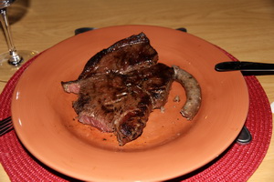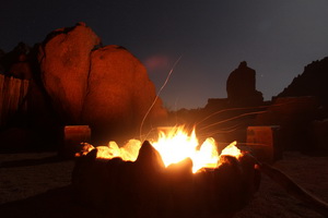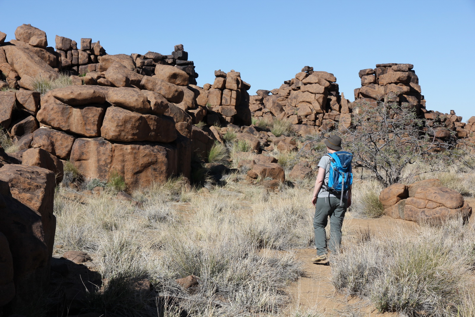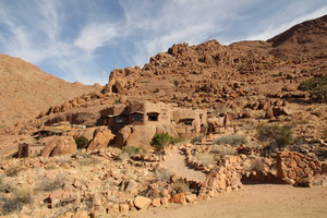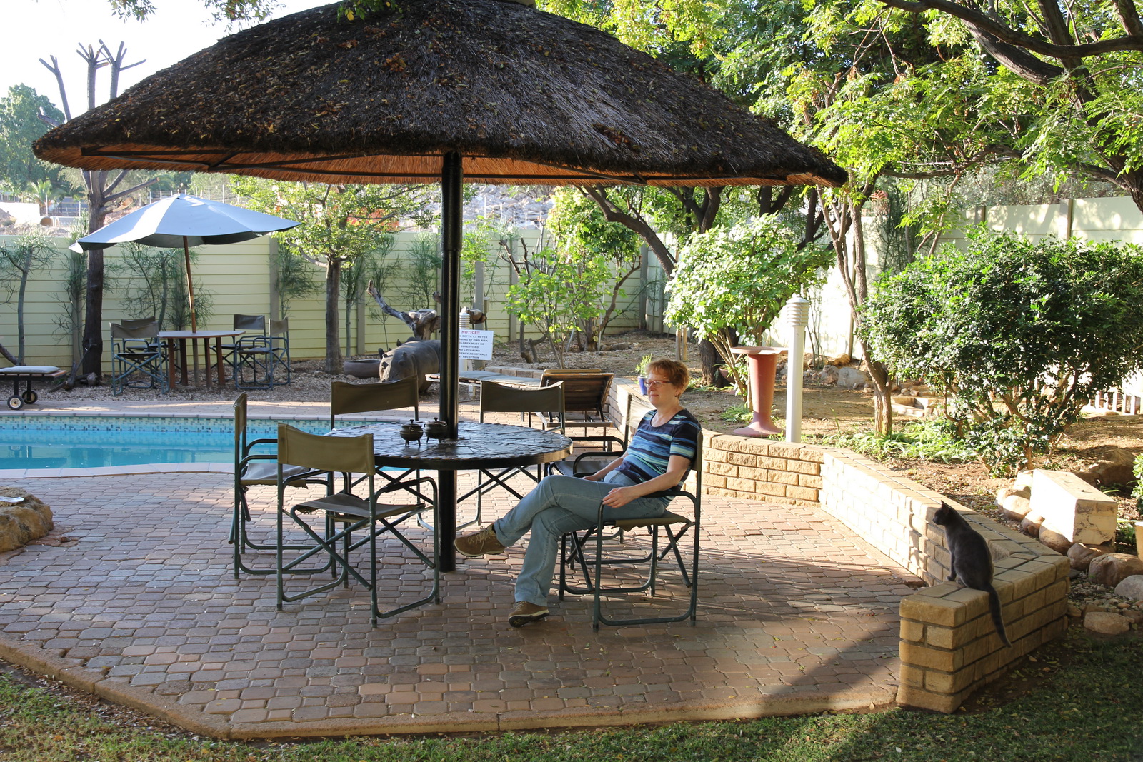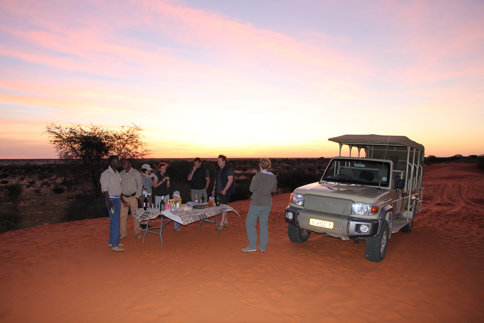 Mit der Sonne aufgestanden, und um 8 Uhr fahren wir die 5 km zum Sesriem Canyon und gehen runter. Es ist noch angenehm kühl. Wir gehen canyonaufwärts, da soll Wasser sein. Die Canyonwände sind bizarr, überhängend, voller Höhlen. Am Ende verhindern heruntergestürzte Felsen das Weiterkommen. Kein Wasser! Wir drehen um und gehen über den Einstiegspunkt hinaus den Canyon hinunter. Hier wird der Canyon breiter, die Sonne scheint rein. Da könnte man währscheinlich noch weit wandern, ab es kommen lästige Fliegen, also drehen wir um. Kurz, aber lohnend. Im Nationalparkbüro holen wir uns noch ein Permit für die Welwitschia-Ebene am Montag, 90N$. Im Tankstellenladen noch 5 l Wasser kaufen, hatten wir gestern vergessen. Der Laden ist viel besser sortiert, als der im Park. Dann auf die Strasse, erst C27, dann C19 Richtung Walvis-Bay. Die ist meist in gutem Zustand, nur in der Mitte ist ein schlechtes Stück, an dem gerade gearbeitet wird. In Solitaire gibt es ein uriges Roadhouse mit angeschlossener Bäckerei. Wir kaufen verschiedene süße Stückle und um 11 Uhr sind wir an der Rostock Ritz Lodge. Die Lage des Campingplatzes ist sehr schön, mit weitem Blick, besonders von der Grillterasse. Es gibt aber fast keinen Schatten. Wir ziehen uns unter das Dach der Campküche zurück, da kann man's aushalten. Die 4 Plätze sind recht eng aufeinander, aber wir sind die Einzigen, so stört das nicht. Der Name Rostock hat nichts mit der deutschen Stadt zu tun, sondern mit dem Rooistock, einem Vulkanberg in der Nähe. Pünktlich um 15:45 Uhr werden wir vom Camp abgeholt und zur Lodge gefahren. Von dort machen wir den Sundowner-Walk. Hoch auf den Hügel hinter der Lodge, mit toller Aussicht auf die umliegenden Ebenen und Berge. Es ist schon kühler, also angenehmes Wandern. Ich scheuche eine Horde von 15 Bergzebras auf, es gelingen ein paar tolle Fotos von der davonstiebenden Herde. Auf dem Rest der Wanderung sehen wir sie immer wieder, aber sie bleiben in sicherer Entfernung. Zurück in der Lodge genießen wir von der Terasse aus einen farbenprächtigen afrikanischen Sonnenuntergang bei kühlem Bier vom Fass und unterhalten uns nett mit den Betreibern der Lodge und anderen Gästen. Dann gehts zum Dinner: Avocado Ritz und Knoblauchbrot als Starter, dann Springbockfilet und Wildgeschnetzeltes, sehr lecker! Nach dem Essen gibts einen Taxiservice zurück zu unserem einsamen Campingplatz. Ein bissle Sterne gucken (wird jede Nacht besser) dann ins Bett. |