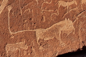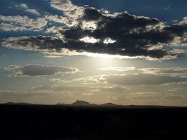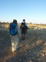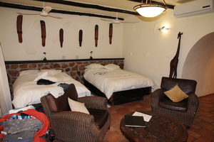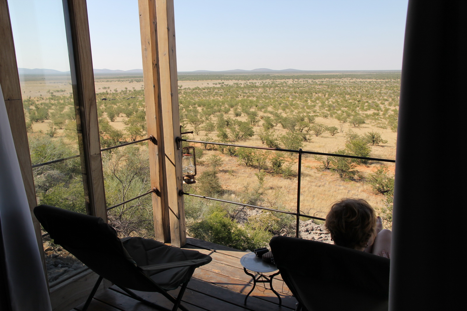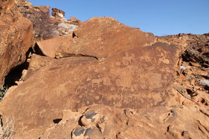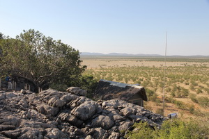Die Nacht war warm, erst gegen Morgen kam etwas Wind auf. Früh aufgestanden, heute haben wir Programm. Wir fahren Richtung Usakos, erst auf schmalen Farmland-Pad, dann auf der frisch gerichteten D1914. Wir brauchen für die 90 km 2 Stunden und das einzige Fahrzeug, das uns begegnet ist der Grader, der die Strasse so schön planiert. In Usakos müssen wir uns erst orientieren. Am Bahnhof steht eine alte Schmalspurdampflok. Und es kommt doch tatsächlich mal ein Güterzug vorbei. Dann gehts auf die D1935/1937 zur Farm Ameib. Dort befindet sich die Bulls Party eine Felsenformation. Tipp von Thomas F. Schon die Fahrt dorthin ist wunderschön. Im Hintergrund das eindrucksvolle Erongo-Gebirge. Die BullsParty ist fantastisch, ich habe noch nirgends solche riesigen Felskugeln gesehen. Manche balancieren auf nur 1-2 m breiten Auflagepunkten. Wir wollen auf einer schönen Bank im Schatten Mittag machen, Sonja setzt sich schon mal hin und ich gehe die Sachen fürs Vesper aus dem Auto holen. Als ich gerade wieder los will, kommt sie mir entgegen. Ich geh da nicht mehr hin, da ist ein Leopard im Gebüsch. Da traue ich mich dann auch nicht mehr hin, so einen Leoparden würde ich ja gerne sehen, aber lieber vom sicheren Auto aus. Also gibts halt ein paar Nüsse und Salzcräcker im Auto, dann tuckern wir schön langsam zurück, Auto-wandern. Wir fahren auf den Pads D2306+D2315+D2316 um das Erongo Gebirge herum zum Erongo Plateau Camp. Die letzten paar Kilometer zum Camp sind steinig, holprig und langsam. Israel, der Campingwart, zeigt uns den Platz und verkauft uns Feuerholz. Den Rest des Tages ist Relaxen bei toller Aussicht angesagt. Abends gibts Rinderflilet und Minikürbisse in Alufolie vom Grill. Dazu ein Swartland CabSauv/Merlot aus der Flasche, viel besser als der Kartonwein. An die beleuchtete Wassertränke kommen heute nur Oryx. Immer noch T-shirt-Temperaturen in der Nacht. Wir sind alleine auf dem Campingplatz. Am nächsten Tag gehts um 7:30 Uhr auf den Wanderpfad hinter