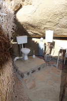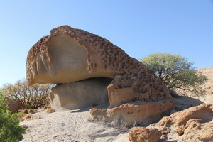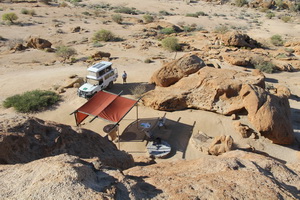 Anschließend noch zur Tankstelle und volltanken. Den nächsten Tag verbringen wir auch hier, da dürfen wir etwas länger schlafen. Nach dem Frühstück wird noch eine Ladung Wäsche gewaschen und aufhgehängt, sie wird in 2 Stunden trocken. Dann gehen wir auf eine Wanderung durch die Felsen. Viele tolle Fotomotive. Bald wird es aber zu heiß und wir gehen zurück zum Camp, sitzen im Schatten und lesen. Wir haben nur noch eine kleine Menge an Feuerholz zum grillen. Es reicht gerade noch für 2 Kartoffeln in der Folie und ein Schweinefilet. Wir machen dann noch den Rest unseres 2l Kartonweins nieder, was vielleicht keine so gute Idee war,ich habe morgens einen Kater. Mit hats hier gefallen, mit den bizarren Felsen, Sonja nicht so gut. |